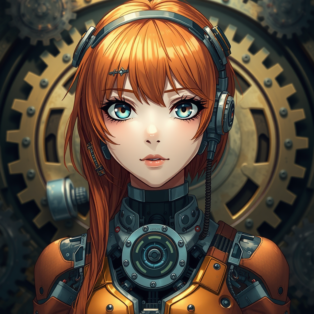 High-quality, centered, 2D illustration, anime style, captivating eyes, flawless face, full body, cinematic composition, instagram-worthy, dynamic pose, clockwork, android, cybernetic, mechanical, repair, cybernetic biochemical steampunk female, orange hair, detailed gears backdrop, intricate design, expert craftsmanship, gentle shadows, atmospheric lighting, ghost in the shell influence, innovative enhancements.