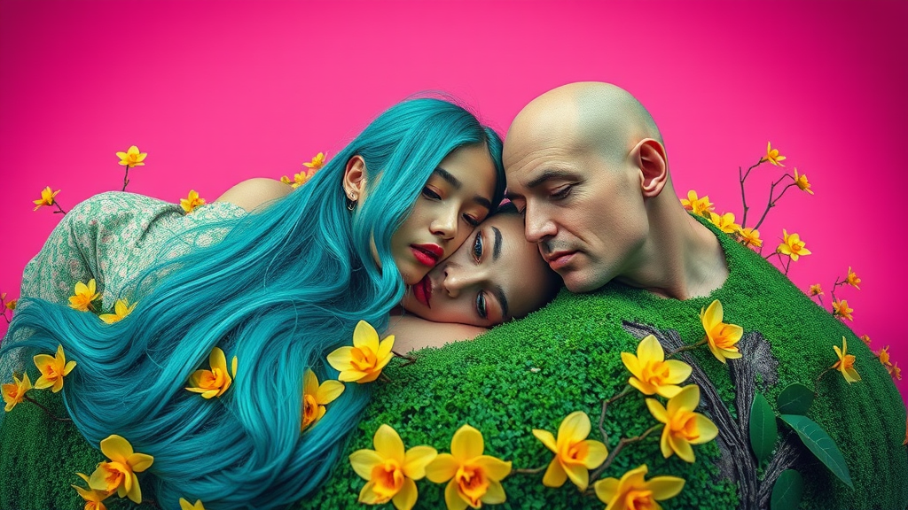 High quality creative fashion image captured with a Hasselblad camera, 200 ISO, f/11, using a Sigma 15mm fisheye lens. Features an ultra-realistic portrayal of a girl with long teal hair, lying down alongside a bald man atop a lush emerald mountain covered in vibrant lemon yellow orchids. The image is in sharp focus with bright, vivid lighting, showcasing bold magenta hues.