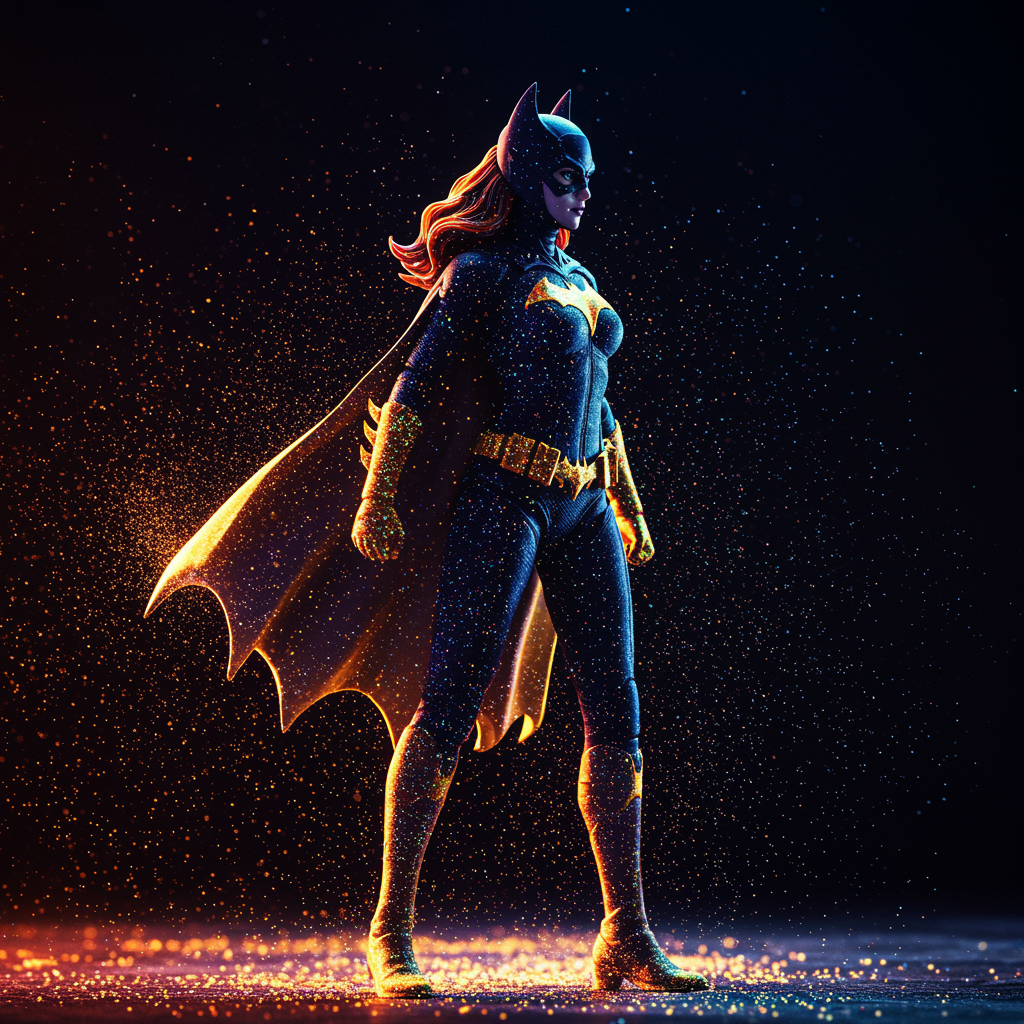 High quality, highly detailed, Batgirl from the DC Universe stands gracefully, exhibiting a slim, athletic build and flowing long hair. She wears a short skirt and a sleek black cape, her mesmerizing figure casting a dazzling display in the darkness. Her silhouette is a spectacle, composed of millions of brilliant ultraviolet light particles, creating an enchanting aura. Batgirl is backlit, with vibrant lights highlighting her form, and the scene is captured in stunning HDR.