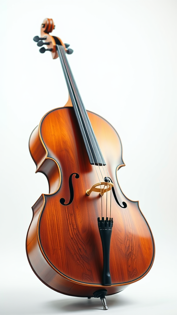 high quality image of a cello, bright, white backdrop, taken with a Leica 50mm lens, f1.4 aperture, showcasing intricate wood grain and craftsmanship, soft background blur to emphasize the instrument's curves and details