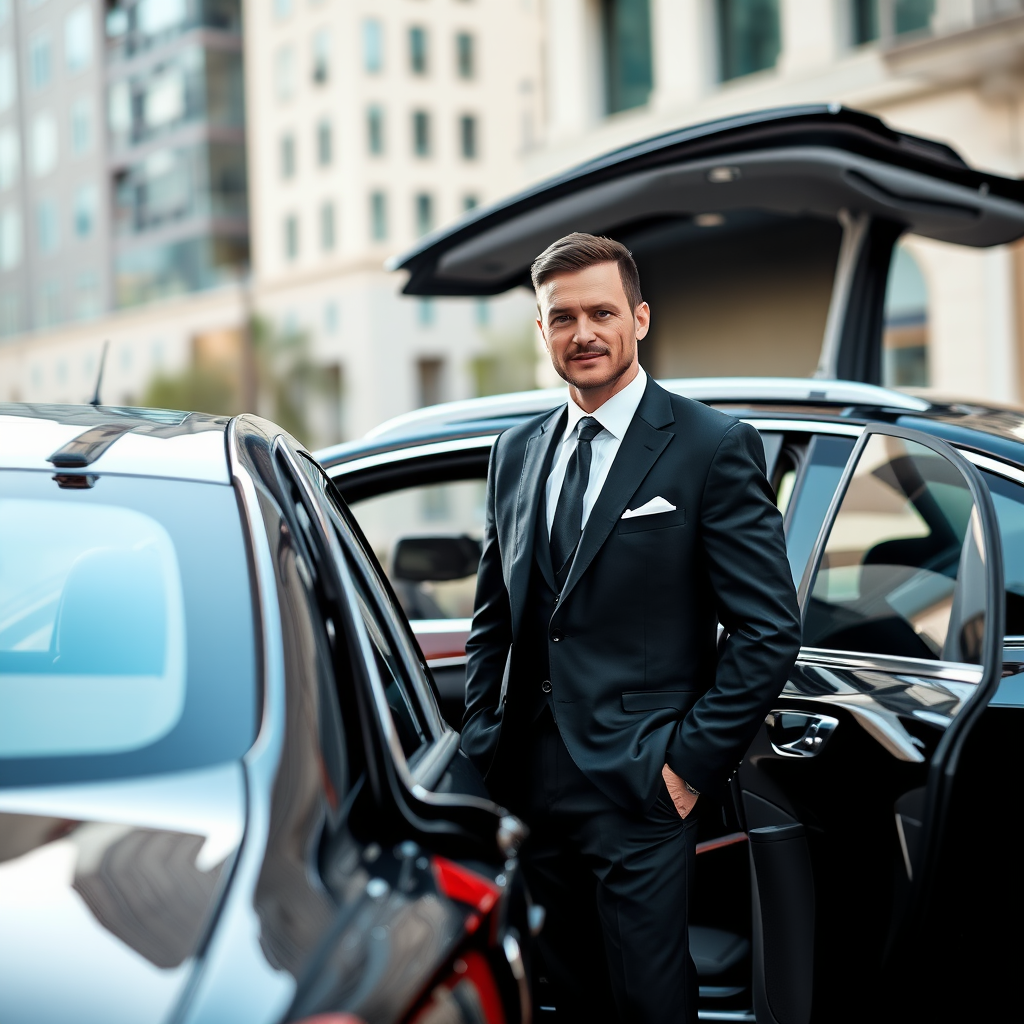 High-quality image of a professional chauffeur service showcasing a sleek, black luxury car parked in an upscale urban setting. A distinguished man in a tailored black suit confidently stands beside the open back door, embodying sophistication and elegance. The close-up shot, captured with a Leica 50mm lens set to f1.4, highlights the gleaming finish of the vehicle and provides a sense of exclusivity and premium comfort for corporate clientele. The scene evokes a sense of prestige and impeccable service, perfect for marketing high-end VIP transport services.