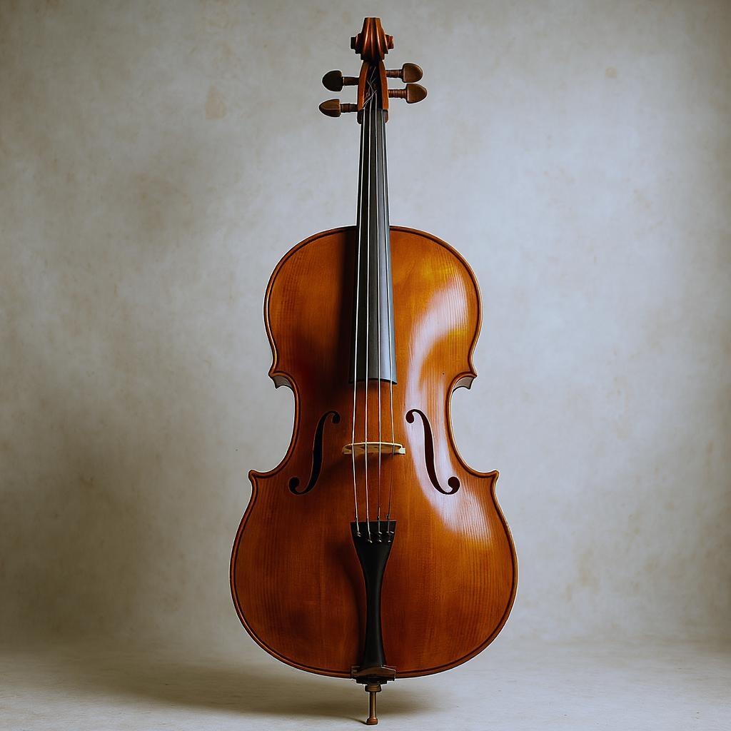 High quality image of a vintage cello, softly illuminated, set against a light background, captured with a Leica 50mm lens at f1.4 aperture, showcasing the instrument's elegant curves and intricate details.