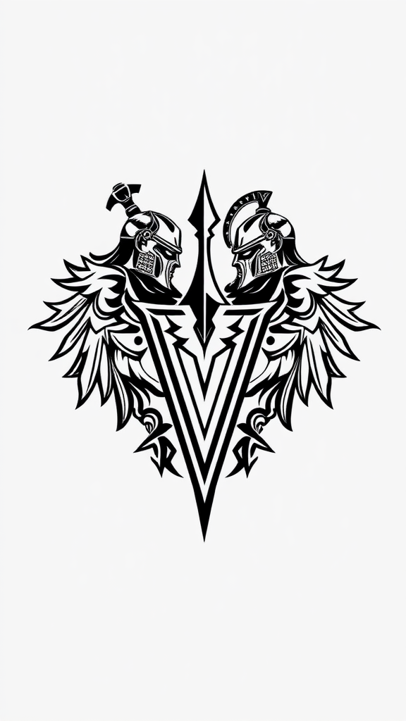 High quality logo of warriors with intricate detailing, crafted in dark metal, featuring geometric shapes and perfect symmetry, enhanced by realistic elements and ray tracing techniques, black and white color scheme, logo design in 8k resolution, maintaining a balanced 1:1 aspect ratio, excluding any prominent use of the letter V.