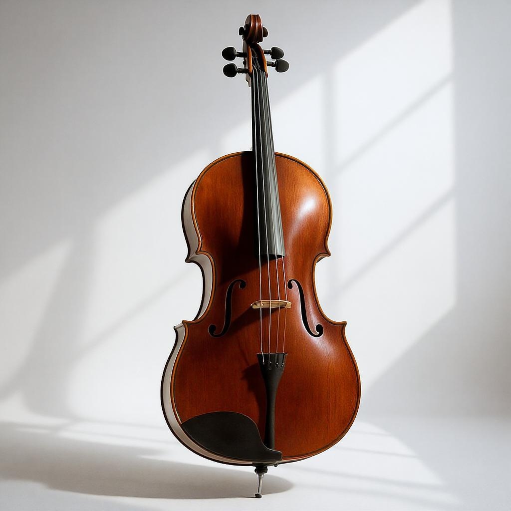 High quality photo of a cello, softly illuminated, set against a bright background, captured with a Leica 50mm lens at f1.4, highlighting the elegant curves and rich wood texture.