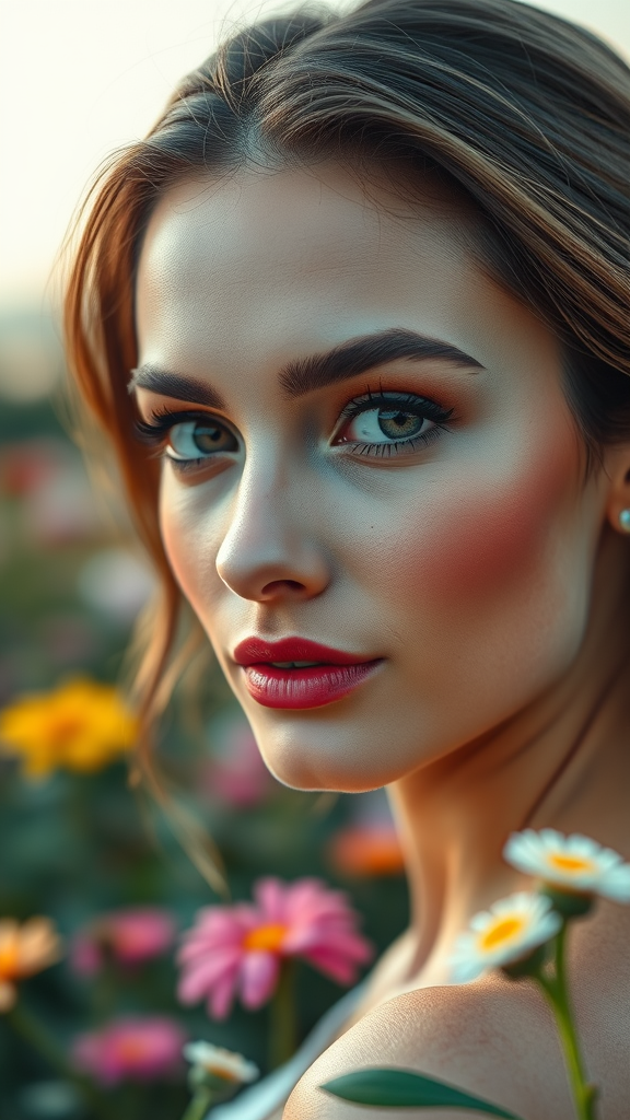 High-quality professional photography, 8K resolution, HDR, with a soft bokeh background and sharp focus on the subject, captures a serene morning sky. The image showcases a model in a flower garden, exuding elegance in an outdoor photoshoot. The model has high detailed and radiant skin, with a beautifully detailed face. Her eyes are strikingly clear, with intricate detail in the pupils, complemented by a touch of lip gloss and blush makeup on her cheeks. Small, delicate earrings add sophistication. The composition avoids elements like paintings or low-resolution sketches, emphasizing clarity and detail throughout.