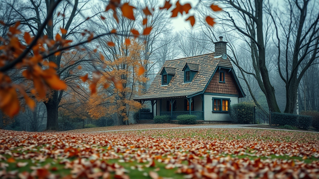 High quality, ultra-detailed CG unity 8k wallpaper, a picturesque landscape featuring a quaint house nestled among fallen autumn leaves, captured in winter hues, reminiscent of award-winning photography. Enhanced bokeh effect with immersive depth of field, showcasing striking HDR contrasts, subtle bloom, and chromatic aberration for a photorealistic finish. Exquisitely detailed textures bring the scene to life, with a serene yet vibrant atmosphere.