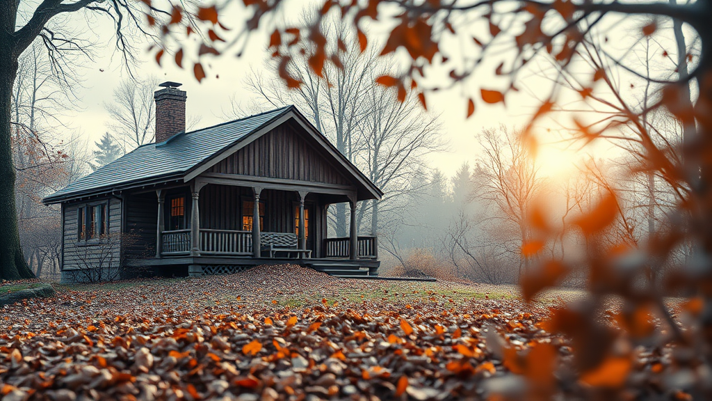 High quality ultra-detailed CG unity 8k wallpaper, serene landscape with intricate textures, a cozy house nestled among fallen leaves in winter hues, inspired by award-winning photography; features soft bokeh effect, masterful depth of field, vivid HDR, gentle bloom, subtle chromatic aberration, photorealistic details, with enhanced realism and captivating atmosphere.