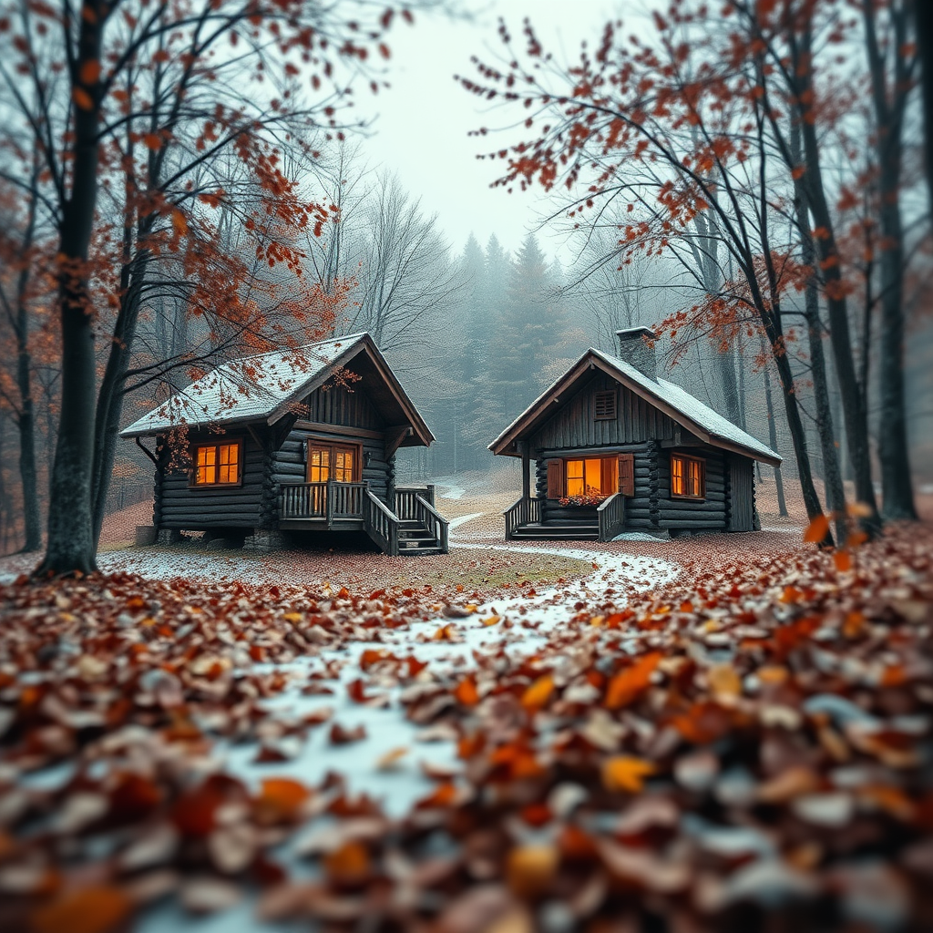 High quality ultra-detailed CG unity 8k wallpaper, serene landscape with rich textures, cozy cabin nestled among fallen leaves with winter hues, inspired by award-winning photography, featuring a dreamy bokeh effect, enhanced depth of field, HDR lighting, soft bloom, subtle chromatic aberration, photorealistic finish, exceptionally detailed composition.