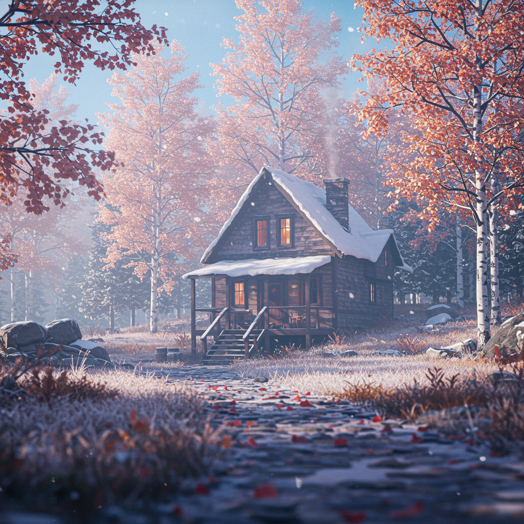 High quality, ultra-detailed CG unity 8k wallpaper, picturesque landscape featuring a cozy house nestled amidst a sea of foliage, adorned with winter hues, capturing the essence of an award-winning photograph. The scene is accentuated by a delicate bokeh effect and meticulous depth of field, enriched with HDR for vibrant contrast. A touch of bloom enhances the serene ambience, while subtle chromatic aberration adds a hint of realism. The composition is photorealistic, with intricate textures and exceptional detail, inviting viewers into a tranquil winter retreat.