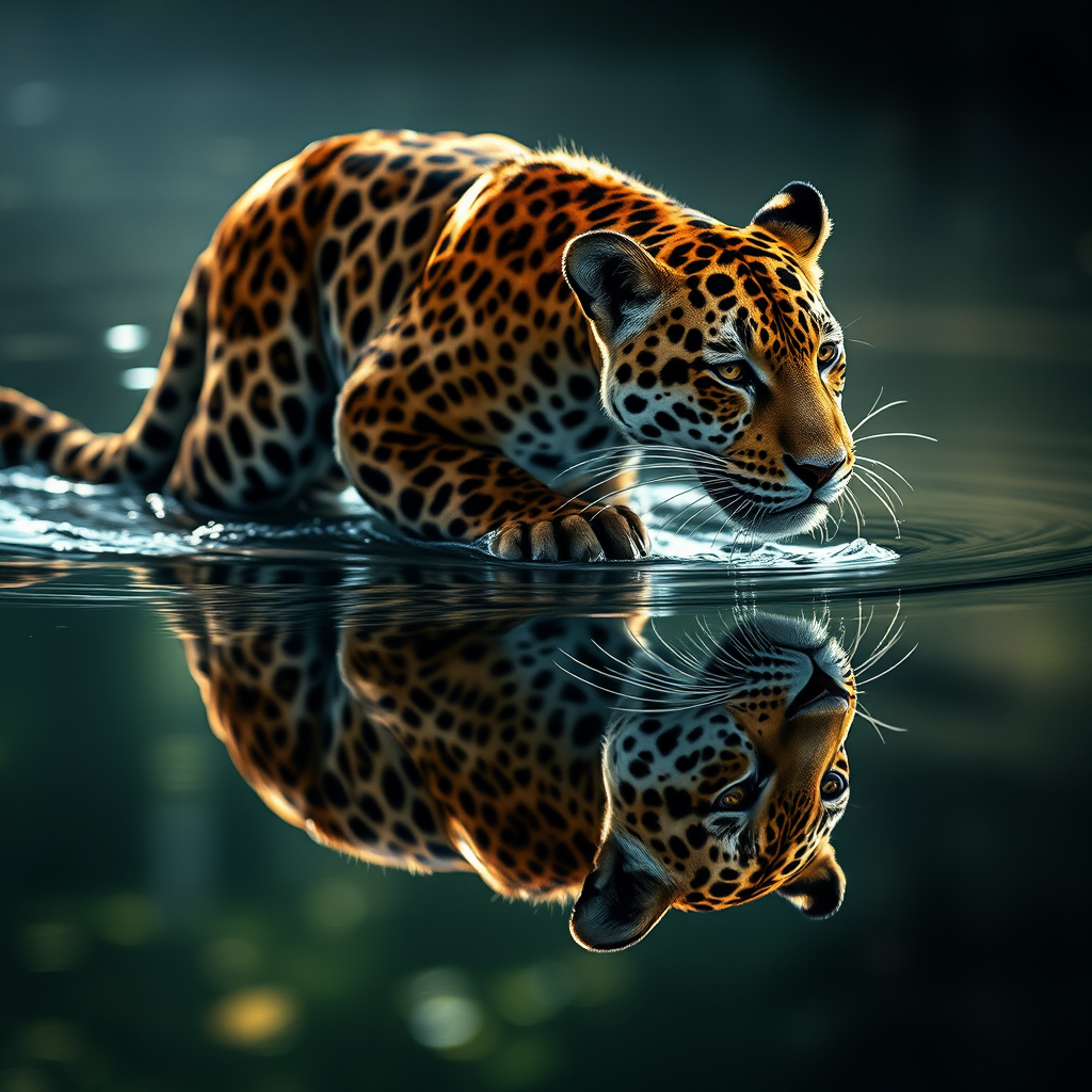 High-quality, ultra high resolution, official wallpaper of a majestic jaguar gracefully traversing water, gazing at its own reflection, dramatic cinematic lighting, adhering to the golden ratio, flawless composition, sophisticated and uncropped, richly detailed in 4k, with sharp focus, a true masterpiece, enhanced by CinemaHelper and PhotoHelper techniques, enveloped in subtle backlight, vibrant HDR, with a touch of artistic flair, capturing the essence of nature's elegance.