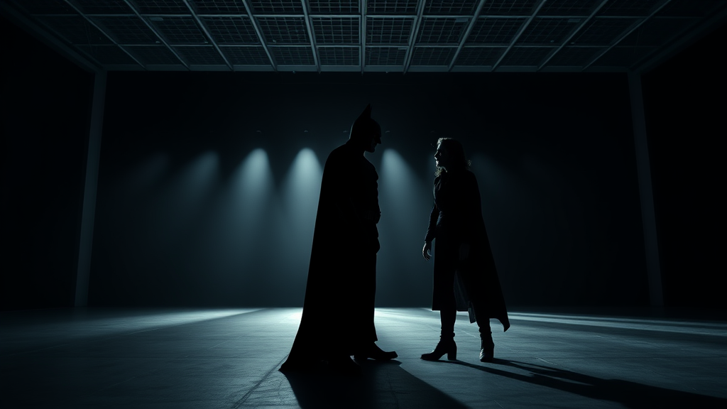 High resolution cinematic photo, Arri Alexa Mini, Carl Zeiss CP-2 lens set, aperture f/2.8 or f/4, ISO 100, shutter speed 1/20, the black silhouette of Batman and Joker confrontation scene, monochromatic, dark backdrop, subtle white grid system ceiling, polished concrete flooring, cinematic light effects, dramatic shadows cascading downward, striking contrast, photorealistic, ultra-detailed, 8K --aspect ratio 9:16 --style raw --personal touch c3uuvrt --version 6.1.