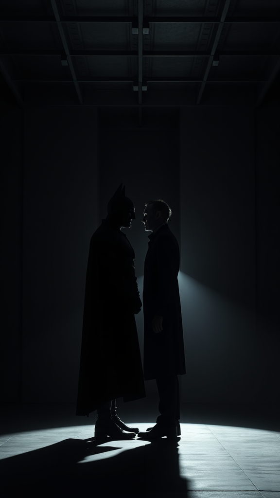 High resolution cinematic photo arri alexa mini carl zeiss cp-2 lens set aperture f/2.8 iso 100 shutter speed 1/20 the black silhouette of Batman and Joker in a tense meeting scene against a monochromatic dark backdrop minimalistic geometric ceiling design concrete flooring dramatic cinematic light effects creating top to bottom shadows with intense contrast photorealistic ultra-high detailing 8K resolution atmospheric mood with subtle color grading to emphasize tension and intricacy --ar 9:16 --style raw --personalize c3uuvrt --v 6.1