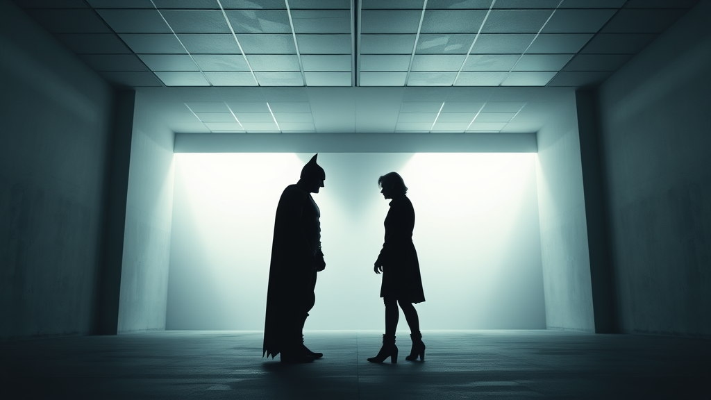 High resolution cinematic photo, Arri Alexa Mini, Carl Zeiss CP-2 lens set, aperture f/2.8 or f/4, ISO 100, shutter speed 1/20, the dark silhouette of Batman and Joker in a tense meeting, monochromatic with a minimalistic white grid ceiling above, concrete flooring below, cinematic lighting casting dramatic top to bottom shadows, high contrast, photorealistic with ultra detailing, 8K quality, aspect ratio 9:16, raw style. The scene is personalized with a unique touch, subtly incorporating elements of mystery and intensity while maintaining the original essence of dramatic tension and visual depth.