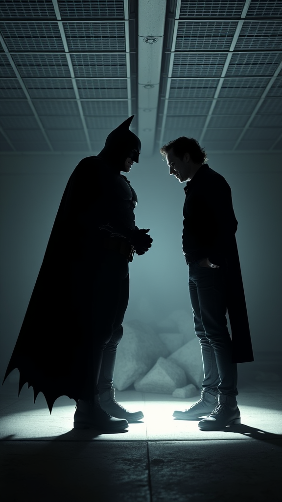 High resolution cinematic photo, shot with an Arri Alexa Mini and Carl Zeiss CP-2 lens set, aperture f/2.8, ISO 100, shutter speed 1/20. The scene depicts the intense black silhouettes of a revised Batman and Joker confrontation, set against a monochromatic backdrop. The setting includes a minimalist white grid system on the ceiling and concrete flooring, with cinematic lighting casting dramatic top-to-bottom shadows and contrast. The image is photorealistic, showcasing ultra detailing in 8K resolution. The atmosphere maintains a raw aesthetic, enhanced by mysterious mist softly diffusing light, adding an unexpected depth to the intense encounter.
