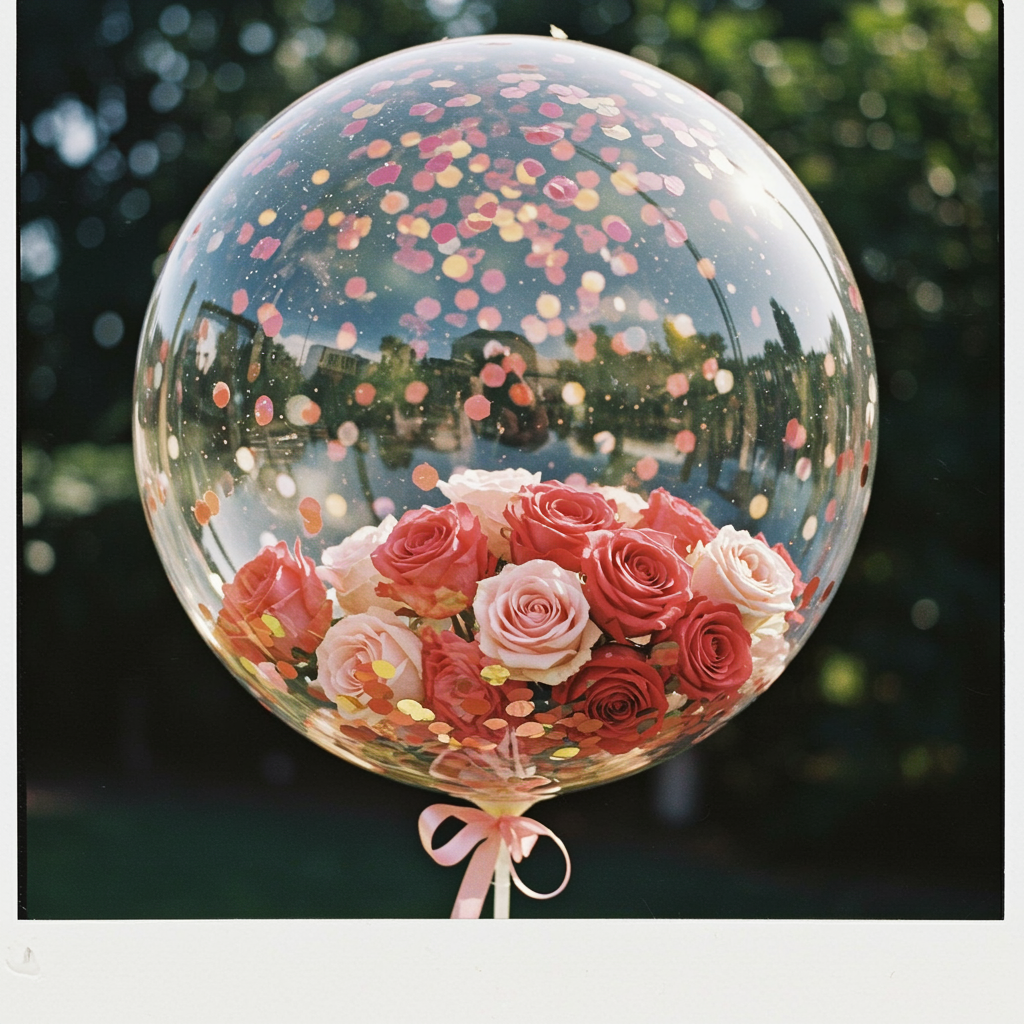 High-resolution disposable photography capturing a giant transparent balloon brimming with vibrant roses and shimmering confetti, set against a softly focused backdrop that enhances its photo-realistic charm. The scene is bathed in gentle sunlight, creating a dreamy atmosphere and highlighting the intricate details of each petal and speck of confetti, aspect ratio 3:4.