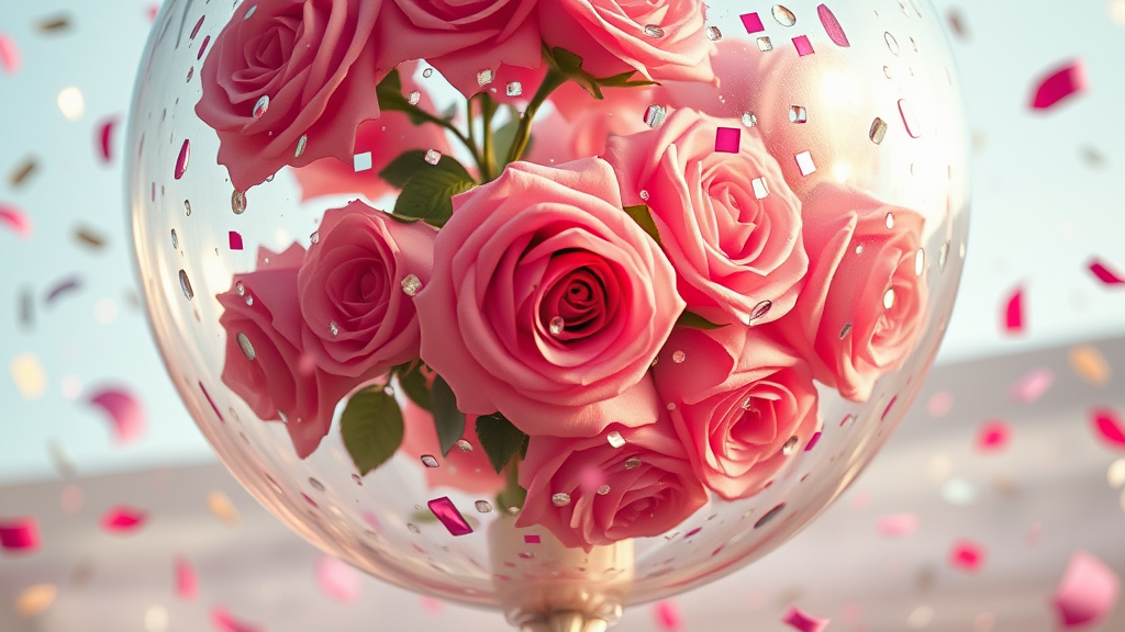 High-resolution image capturing a massive transparent balloon filled with vibrant roses and shimmering confetti, showcasing incredible detail and photo realism, with the aspect ratio of 3:4, captured in a style reminiscent of disposable photography, adding a touch of nostalgic charm.