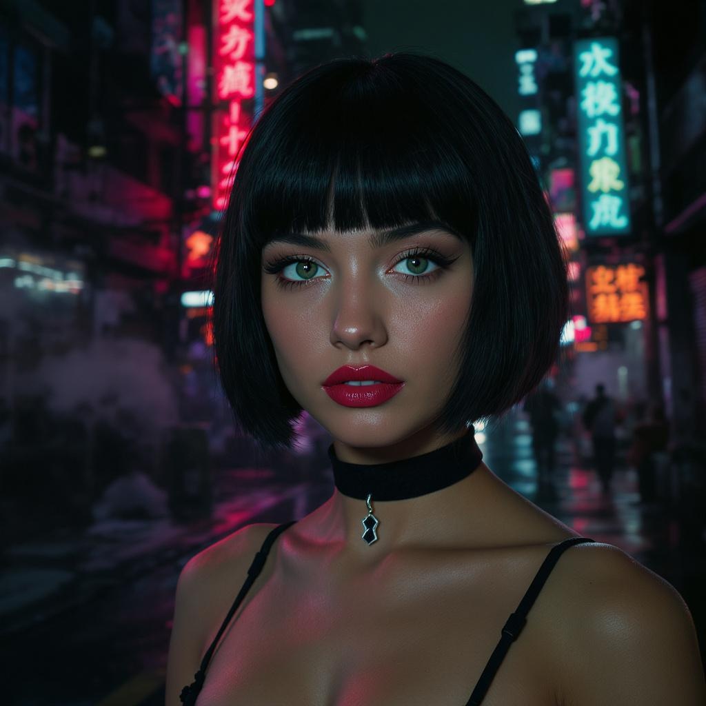 A stunning, high-resolution image of a young woman with sleek black bob-cut hair, captivating mint green eyes, and subtle light freckles. She gazes directly at the viewer with an intense presence. Around her neck, she wears a stylish choker that adds an edgy touch to her look. The scene is set in a moody, futuristic cyberpunk cityscape that hums with neon lights and dark intrigue, perfectly complementing her enigmatic aura.