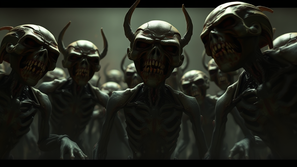 High-resolution image from an animated feature film, depicting a menacing assembly of undead creatures, lifelike 3D animation, blending elements of horror with intricate CGI, dominated by a somber and moody color scheme, enhanced by dramatic and theatrical lighting.