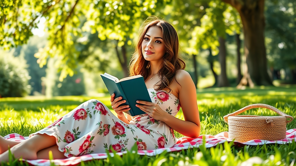High-resolution image of a stunning woman in a floral summer dress lounging on a picnic blanket in a lush, sun-dappled park, photorealistic quality, UHD. Captured with a Sony A7III, the scene is bathed in natural lighting, emphasizing the vibrant colors of the dress and the serene green surroundings. She holds a book, enjoying the peaceful outdoor ambiance, with soft sunlight filtering through the tree leaves, casting gentle shadows around her, aspect ratio 50:111.