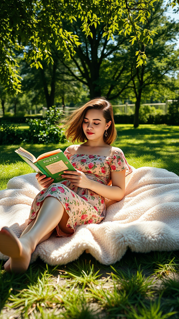 High-resolution image of an elegant woman in a floral summer dress lounging on a plush blanket in a sunlit park, photorealistic detail, shot on a Sony A7III. Lush greenery surrounds her, dappled sunlight filtering through trees, enhancing her serene expression as she reads a book. A gentle breeze tousles her hair, creating a dynamic atmosphere, with shadows casting intricate patterns on the ground. Optimal photography captures vibrant colors and textures in ultra-high definition.