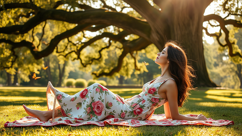 High-resolution image of an elegant woman in a flowing floral summer dress lounging on a patterned picnic blanket under a large oak tree in a sunlit park, photorealistic quality, UHD captured with a Sony A7III, exceptional photography with warm natural lighting, butterflies gently floating nearby, a soft breeze creating movement in her hair, calm and serene atmosphere in the golden afternoon light.