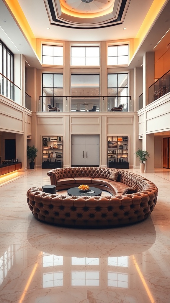 View this AI-generated image featuring a luxurious high resolution interior captures a serene sunken living room featuring an inviting conversation pit with an opulent oversized leather sofa exuding regal charm the polished marble floor extends across the expansive space complemented by lofty ceilin