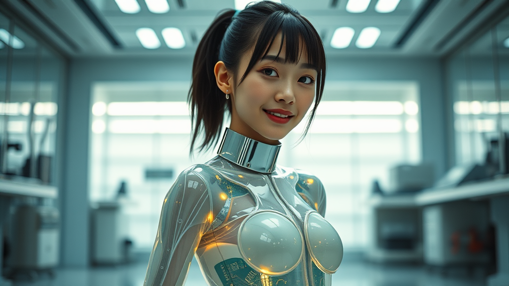 "High resolution live action scene, featuring a very detailed masterpiece of a Japanese actress with complete anatomy, captured in a full body shot. She is kneeling with hands behind back, her expression searching with a slightly tilted head and a gentle, open-mouthed smile. Her perky, cute face and delicate facial features exude charm, complemented by a shiny, jet-black ponytail. Her skin is radiant and glistening with a sheen of sweat, while her beautiful irises sparkle. She is attired in a sleek, transparent polymer suit with a pearlescent sheen that clings perfectly to her form, subtly revealing intricate electronic circuits within her body. A thick metal collar encircles her neck, adding a touch of futuristic intrigue. The setting is a pristine laboratory interior, enhancing the overall aura of sophisticated sci-fi elegance."