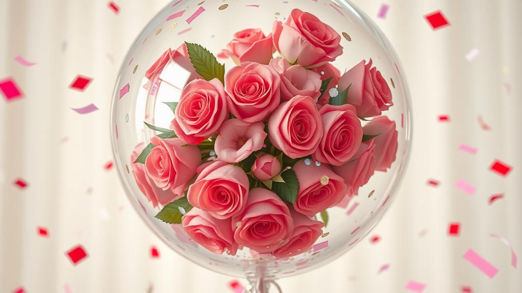 High-resolution photo realistic image of a massive, clear balloon filled with vibrant roses and shimmering confetti, set against a soft, diffused light background.
