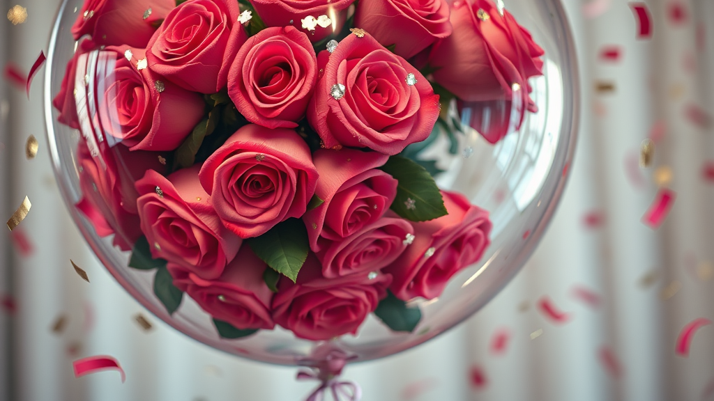 High-resolution photograph capturing a massive see-through balloon brimming with vibrant roses and sprinkled with shimmering confetti, emphasizing photorealistic texture and detail, set against a blurred background for a 3:4 aspect ratio.