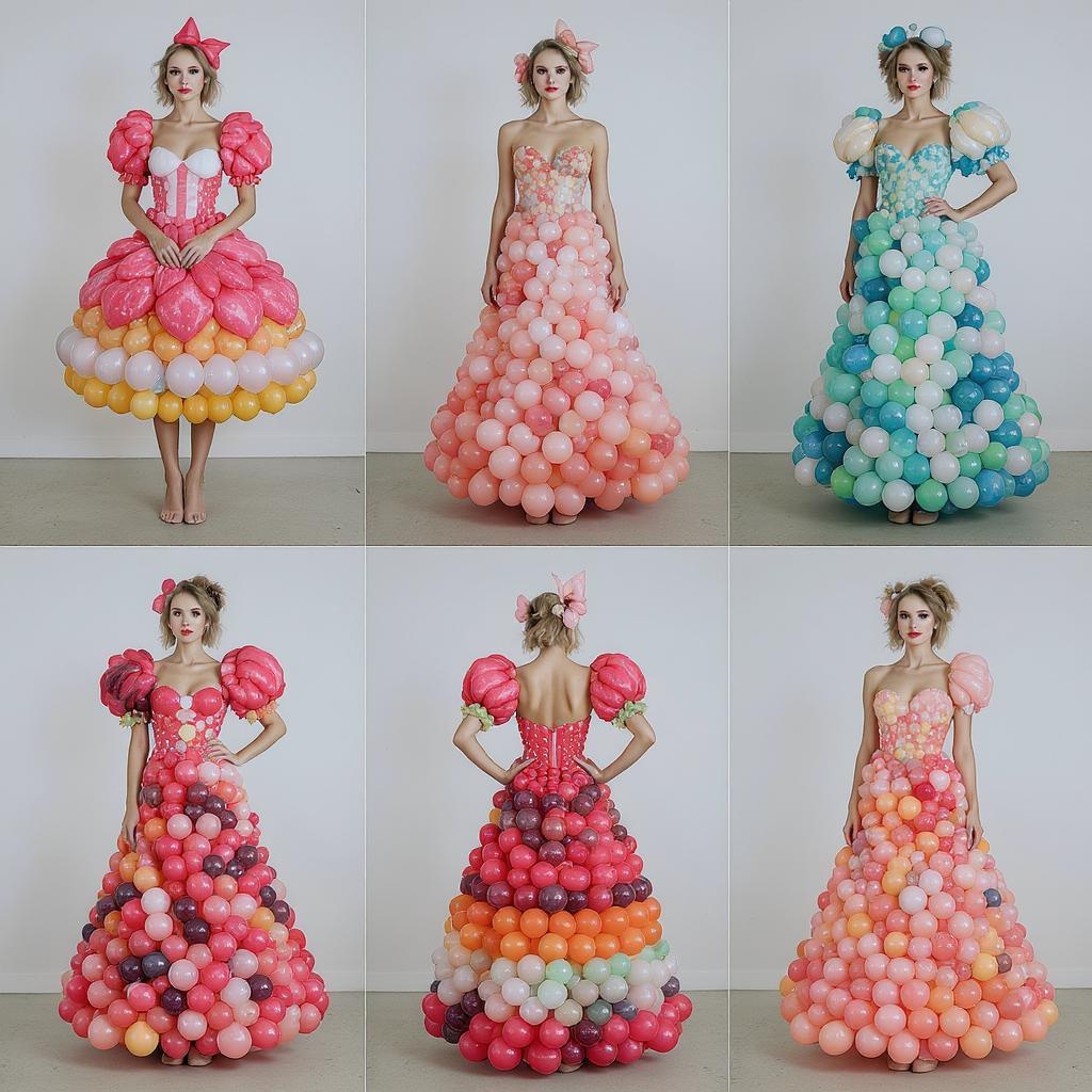 High-resolution photograph of female fashion models showcasing stunning dresses made entirely from intricately arranged balloons, capturing a whimsical and avant-garde look. Each dress features a unique design, with vibrant colors and playful patterns, embodying the spirit of disposable photography. The models pose confidently against a simple backdrop, highlighting the exquisite craftsmanship and airy elegance of their balloon dresses, presented in photo-realistic detail. Aspect ratio 3:4.