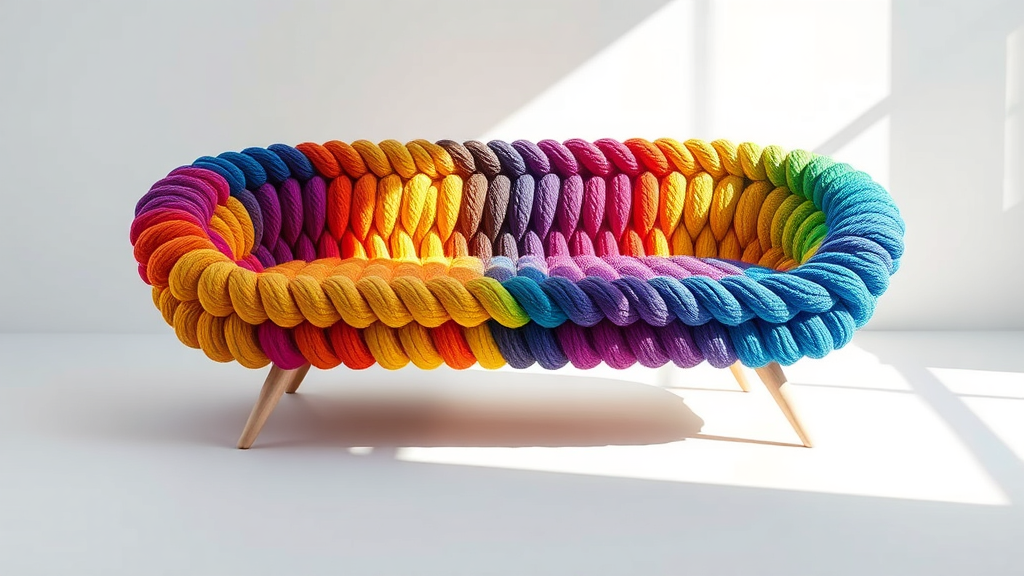 High resolution photography, avant-garde single sofa design, inspired by the spectrum of a rainbow, featuring an elegant curved form, vibrant chunky rope-like texture, captured with a Phase One XF IQ4 150MP camera during a tethered shoot, postmodern aesthetic, set against a pristine white backdrop, enhanced by realistic sunlight creating gentle shadows, accentuated by rim lighting, with light wooden leg features, boasting a studio quality finish, maintaining a raw style and high level of stylization.