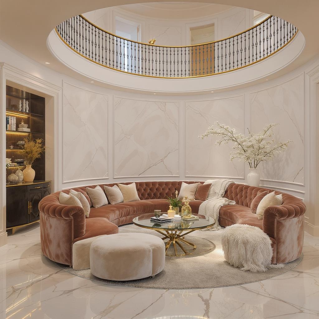 High-resolution photography captures a luxurious interior design showcasing a dreamy sunken living room with a sophisticated conversation pit. A regal, large velvet couch replaces the leather one, enhancing the sense of opulence. Polished marble floors reflect the grandeur of the double-height ceiling. The color palette incorporates touches of soft earth tones with beige, black, and white, harmonized with pastel accents. The scene is worthy of an interior design magazine, exuding a warm, cozy atmosphere perfect for intimate gatherings.