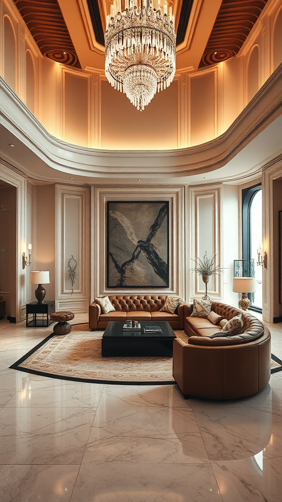 High resolution photography captures a luxurious interior design featuring an enchanting sunken living room conversation pit. A grand, sumptuous leather couch sits regally in the center, inviting and elegant. The polished marble floor reflects the glow of soft, ambient lighting from a high ceiling above, creating a sense of spaciousness and opulence. The color palette is a harmonious blend of beige, black, white, and muted pastel tones, adding an understated sophistication. This captivating scene appears ready for a spread in an interior design magazine, exuding a cozy yet refined atmosphere.