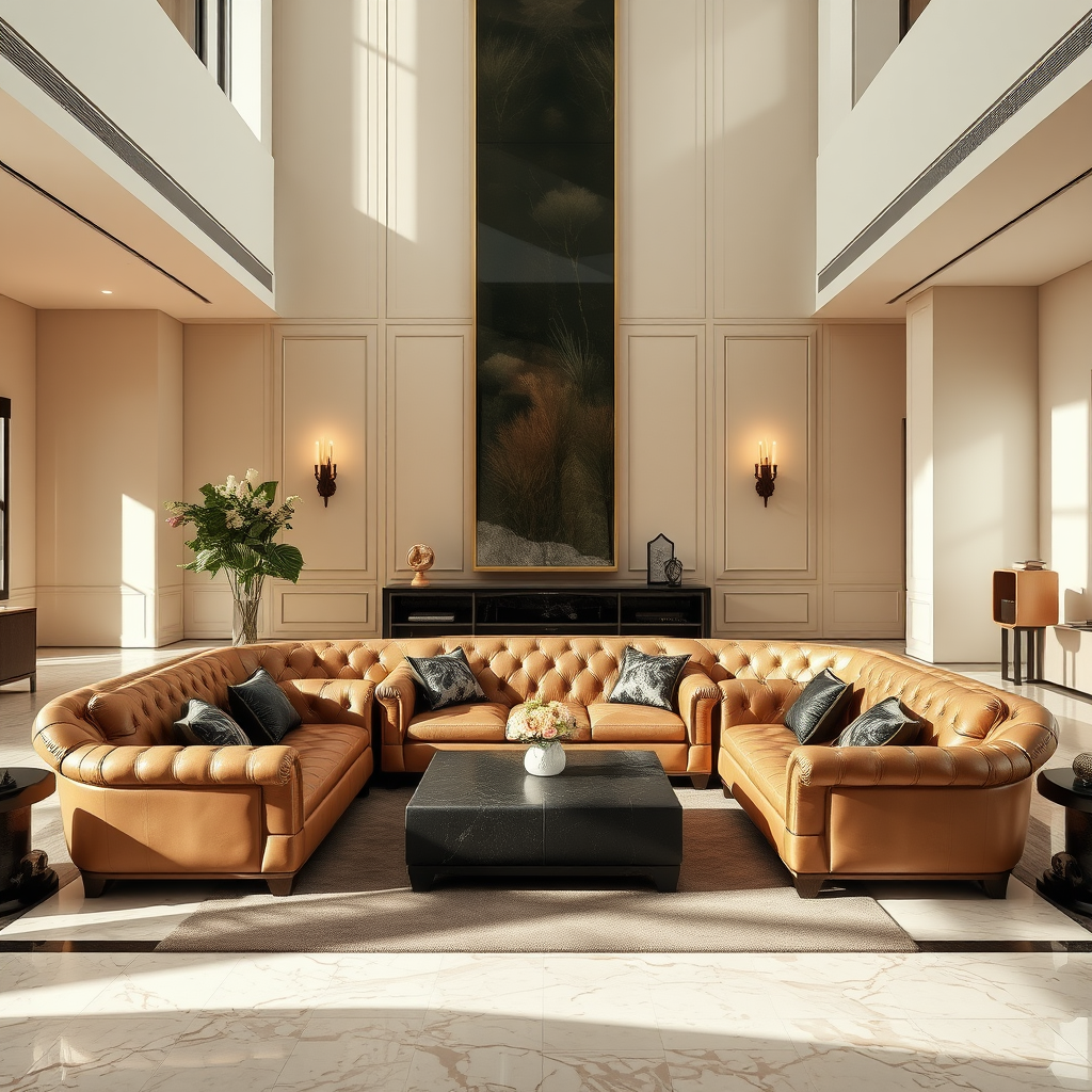 High-resolution photography captures a stylishly designed sunken living room conversation pit featuring an opulent leather couch exuding royal elegance. The space boasts a polished marble floor and soaring high ceilings, enveloped in a soothing palette of beige, black, and soft pastels. The room radiates a cozy yet refined atmosphere, reminiscent of a high-end interior design magazine spread, where luxury and comfort seamlessly converge.