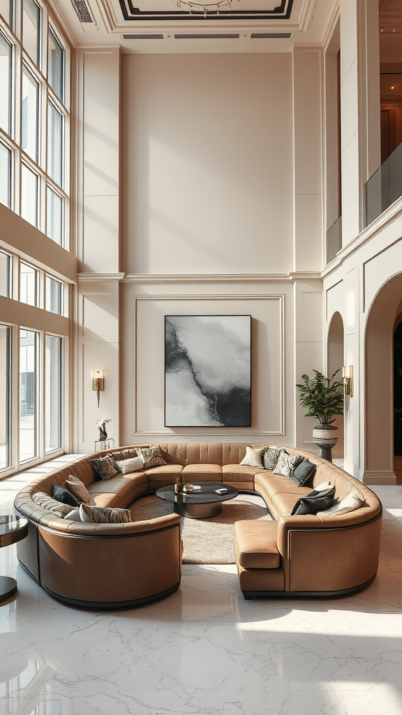 High-resolution photography capturing an elegantly designed sunken living room conversation pit, featuring a luxurious leather couch exuding a sense of royalty. The space is anchored by polished marble flooring and enhanced by soaring high ceilings. The color palette blends beige, black, and white with subtle pastel accents to create a harmonious and sophisticated ambiance. The cozy and inviting atmosphere is reminiscent of a high-end interior design magazine spread.