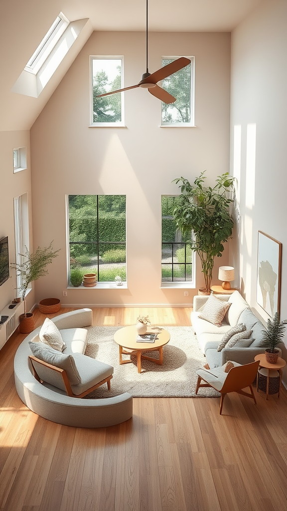 High resolution photography interior design, enchanting sunken living room conversation pit, natural wood flooring, petite windows offering glimpses of the lush garden, Bauhaus-inspired furniture and decor, lofty high ceilings, soft beige, serene blue, and gentle salmon pastel tones, reminiscent of an interior design magazine, invitingly cozy atmosphere; 8k quality, intricate detail, photorealistic with authentic light play, expansive wide angle, kinfolk photography style, A+D architectural elegance.