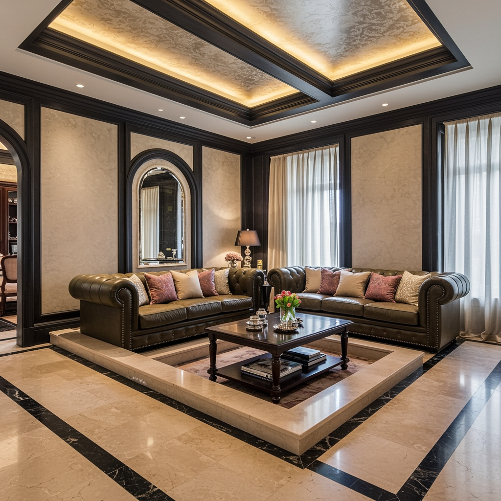 High-resolution photography interior design of a luxurious sunken living room conversation pit featuring an opulent leather sofa exuding a regal presence, set against a polished marble floor. The room boasts a high ceiling and a soothing color palette of beige, black, and soft pastels. The setting exudes a cozy yet sophisticated ambiance, worthy of a feature in an elite interior design magazine.
