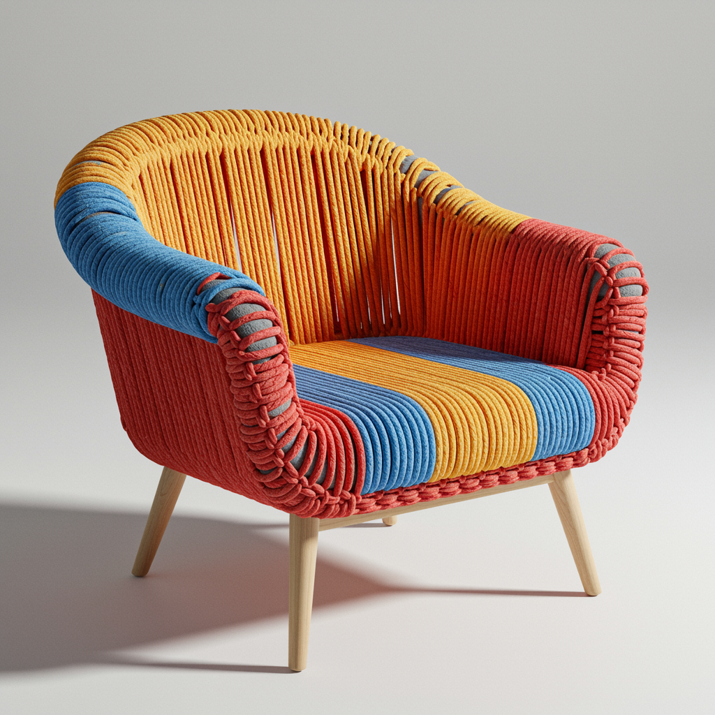 High resolution photography of a conceptual single armchair inspired by the rainbow, featuring a uniquely curved form and a vibrant, thick braided rope texture. Captured with a Phase One XF IQ4 150MP camera, utilizing tethered shooting. The design embraces postmodernism, set against a solid white backdrop with realistic sunlight casting soft shadows and a subtle rim lighting setup. The chair includes light wooden legs and showcases a studio quality finish.