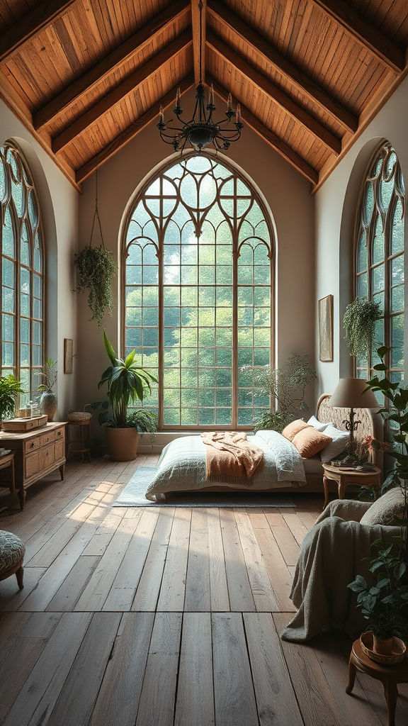 High-resolution photography of a dreamy sunken bedroom featuring a rustic wooden floor, with expansive tall windows revealing a lush garden view; an abundance of plants fills the space, complementing the gothic-inspired furniture and decor. The room serves as a sacred sanctuary with its high ceiling, adorned in a soothing beige, blue, and salmon pastel palette. This interior design, reminiscent of a luxury magazine spread, exudes a warm, cozy atmosphere. Captured in 8k resolution, the intricate detail and photorealistic lighting create a realistic portrayal, while a wide-angle kinkfolk photography style and touches of A+D architecture influence subtly enhance the scene.