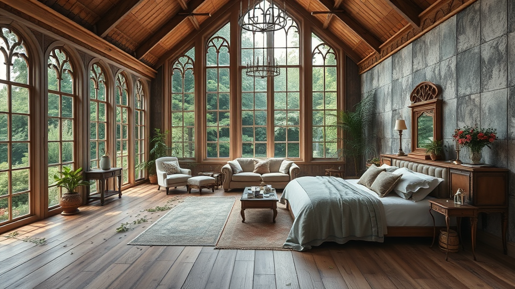 High-resolution photography of a dreamy sunken bedroom with a rustic wooden floor and expansive tall windows that reveal a lush garden view, lush greenery scattered throughout the space. The room features elegant gothic furniture and decorations, creating a sacred interior sanctuary with soaring ceilings. A soothing palette of beige, blue, and salmon pastels is used, enhancing the cozy atmosphere reminiscent of an interiors magazine. Captured in 8k with intricate details and realistic lighting, the wide-angle shot exhibits kinkfolk photography elements, blending contemporary design with historic charm, curated by avant-garde architects.