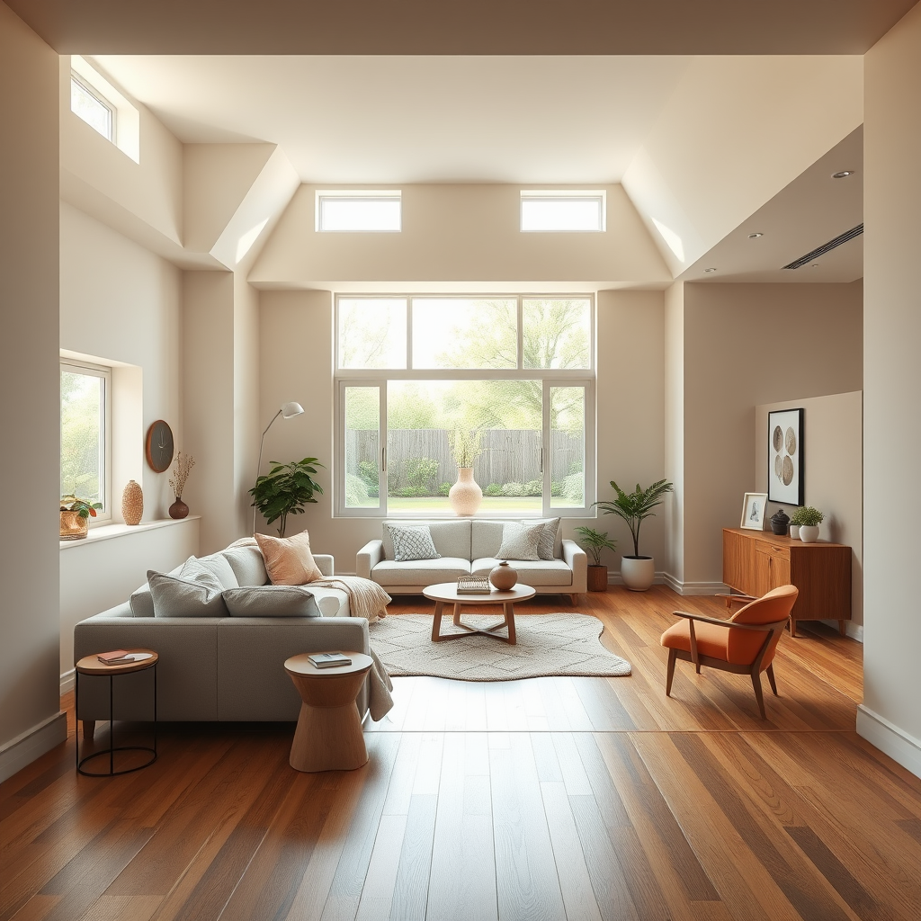 High-resolution photography of a modern interior design featuring a dreamy sunken living room with a conversation pit, against a backdrop of elegant wooden flooring. The space is illuminated by small windows that open onto a serene garden, allowing natural light to flood in. The room is adorned with Bauhaus-inspired furniture and decorations, maintaining clean lines and functional beauty. The high ceiling adds to the airy ambiance, while a soothing palette of beige, soft blue, and pastel salmon creates a harmonious blend. The setting feels straight out of an interior design magazine, exuding a cozy and inviting atmosphere. Shot in 8k with intricate detail, the photorealistic lighting and wide-angle kinkfolk photography capture every aspect of the A+D architecture and design nuances vividly.