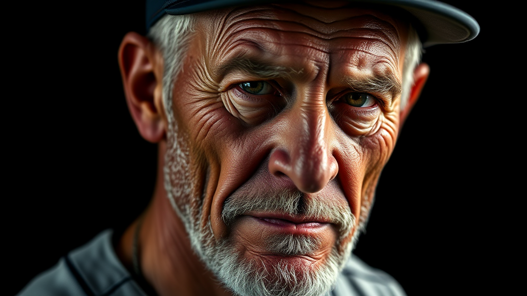 High-resolution photography of a weathered, seasoned baseball player, studio lighting, 8k octane rendering, exquisitely detailed with intricate features, set against a solid black background, professional color grading, aspect ratio 9:16, capturing the essence of endurance and legacy in sports.