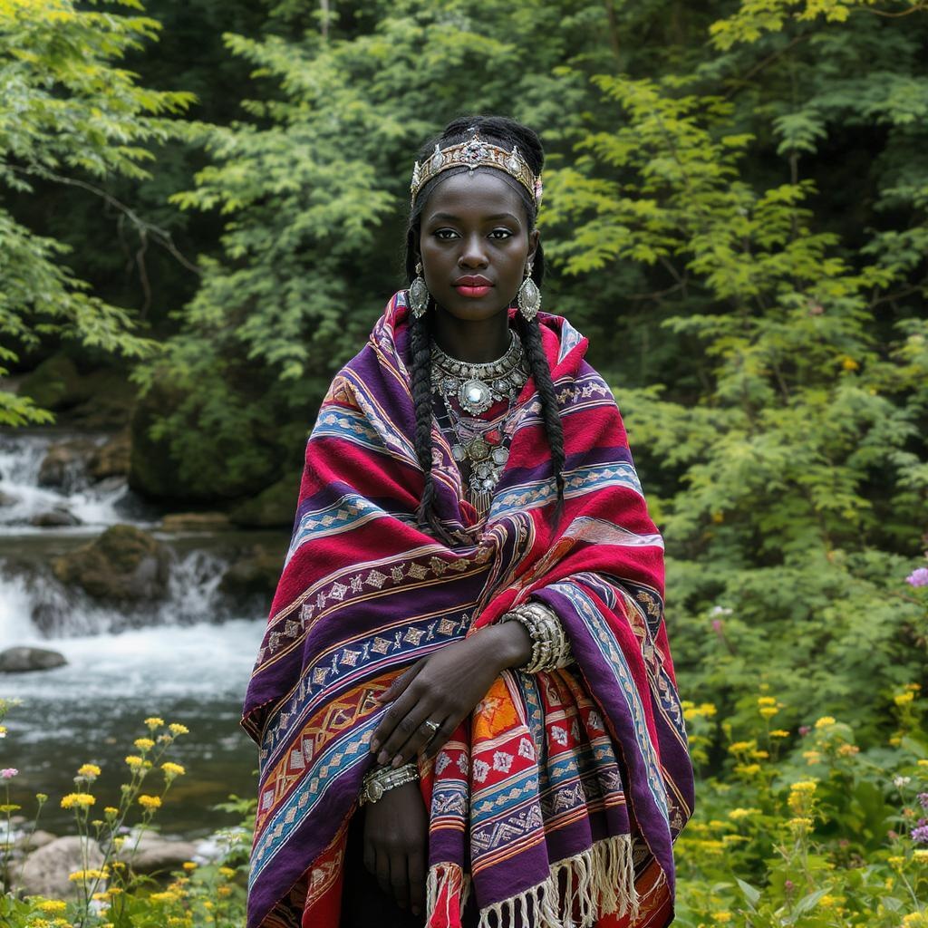 High resolution photography of a woman from the Kyowa community wearing intricate silver jewelry and a vibrant woven shawl adorned with traditional patterns, standing gracefully in a lush green forest near a flowing river. Sunlight filters through the tall trees, highlighting her serene expression and the natural beauty of her surroundings, while colorful wildflowers bloom around her feet and a gentle breeze catches the fringe of her shawl.