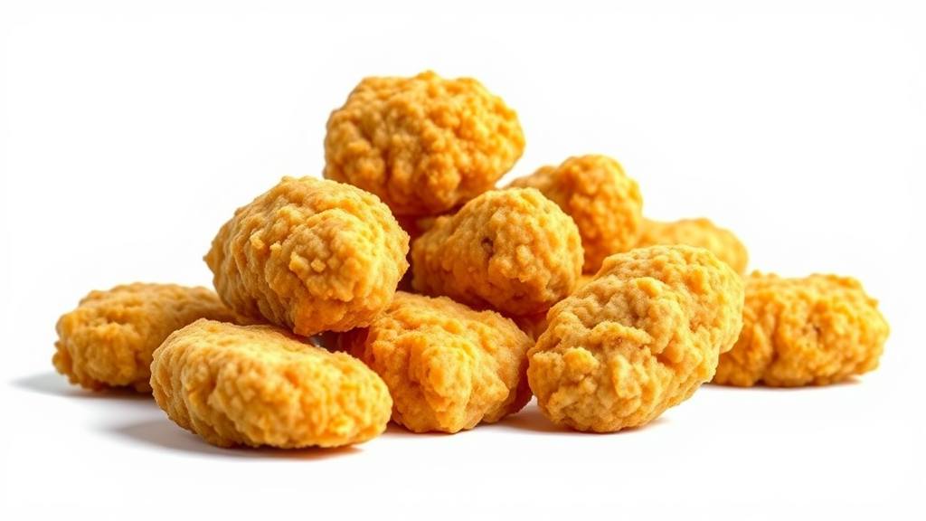 High-resolution photography of crispy chicken nuggets, bright white lighting, studio setup, ultra-realistic 8k rendering, exceptionally detailed, hyperrealistic textures, isolated on a stark white backdrop, high-definition commercial imagery, professional post-color grading, vertical aspect ratio showcasing intricate details suitable for stock photography, maintaining a polished and professional look.