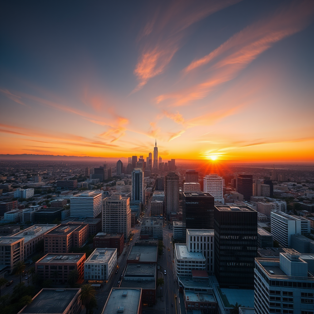 High resolution photography of Los Angeles at sunset, 8k, with intricate detail capturing the vibrancy of the city, photorealistic with dynamic natural light, wide angle perspective showcasing the sprawling urban landscape, inspired by kinfolk photography aesthetics, emphasizing modern and historic architecture.