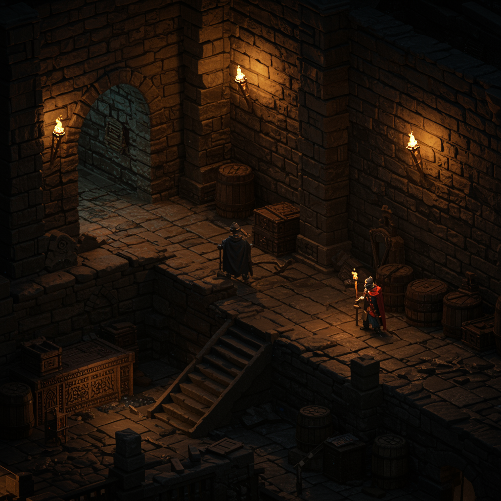 High-resolution pixel art depicting an underground dungeon scene, illuminated by flickering torches casting dynamic shadows across stone walls. Set during night, the ambiance is mysterious and foreboding. The intricately detailed setting exudes an Elden Ring-inspired atmosphere, with meticulously crafted textures and vibrant colors in 4K quality, exemplifying the pinnacle of pixel artistry.