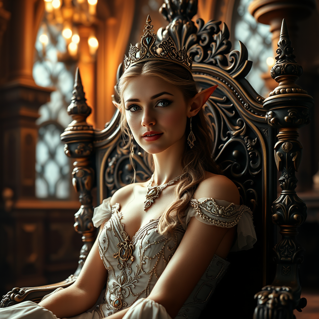 High-resolution portrait of an enchanting royal elf woman with captivating features, adorned in an exquisite gown, seated gracefully on an ornate throne within an opulent fantasy castle hall, soft focus bringing an ethereal quality, dramatic and cinematic lighting akin to a film scene, captured as if with a Nikon D850, vivid HDR richness, 8k CyberRealistic effect, subtle hints of dreamlike ambiance.