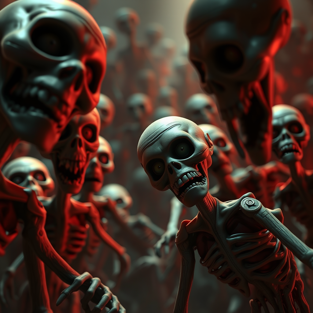 High-resolution still from an animated feature film by a renowned studio featuring a swarm of animated undead characters, detailed 3D computer-generated imagery with a horror theme, using a deep and moody color scheme, with dramatic and atmospheric lighting.