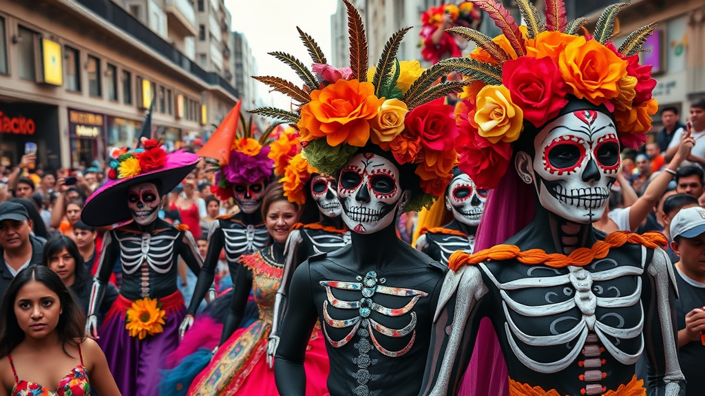High-resolution ultra-realistic photography capturing the vibrant Dia de los Muertos Parade in Mexico City, featuring colorful costumes, intricate face paint, and lively floats amid the bustling city streets, evocative and stylized with a sense of motion and celebration, aspect ratio 1:2, highly stylized atmosphere.