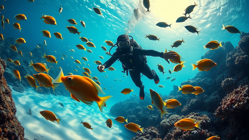 High-resolution underwater photograph showcasing a scuba diver in a sleek wetsuit, with a mask and breathing regulator, gracefully exploring a vibrant coral reef. The scene is teeming with large, colorful tropical fish darting around in a mesmerizing dance of movement and color. The sunlight filters through the water, creating dynamic patterns on the sandy ocean floor. The overall effect captures a National Geographic-level of photorealism and detail, emphasizing the awe-inspiring beauty and diversity of marine life in a dynamic vertical composition.